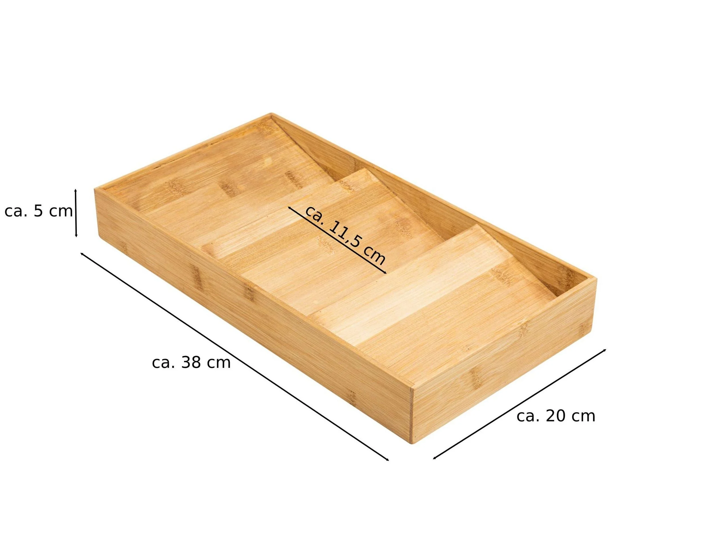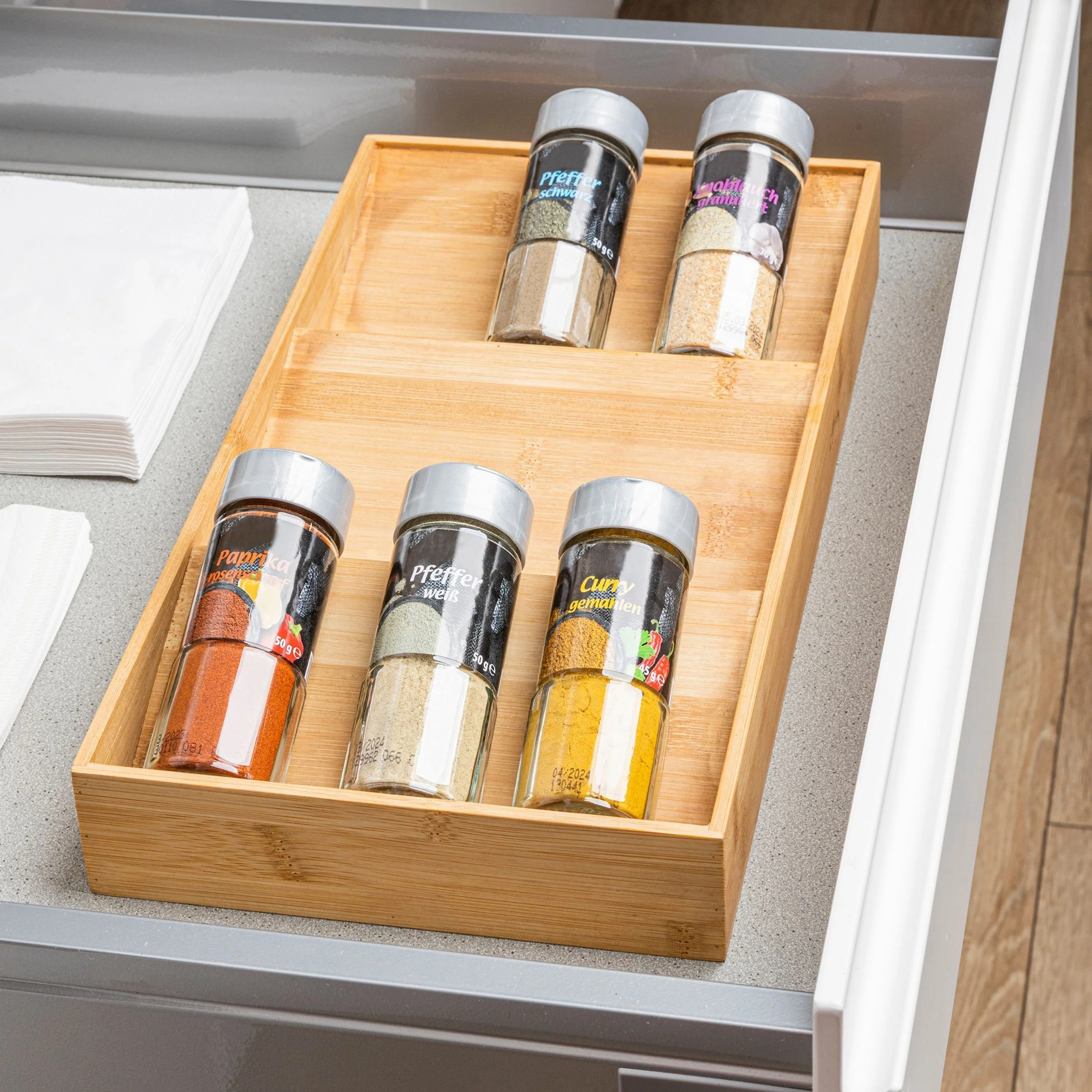 Highlights: Praktischer Schubladeneinsatz aus Bambus mit 3 Stufen, platzsparend, dekorativ und ideal zur geordneten Aufbewahrung von Gewürzen in der Küche.