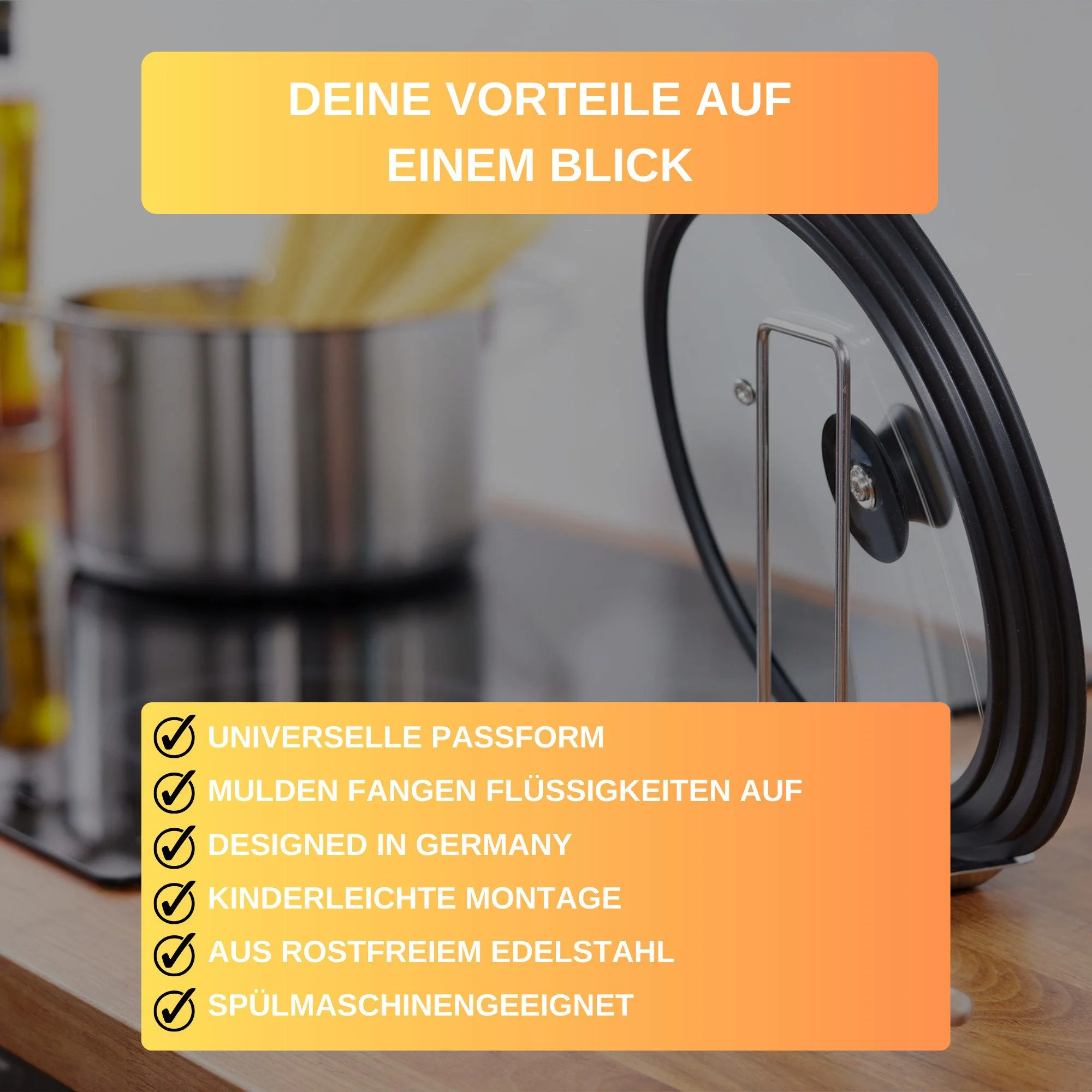 Highlights: Ordentliche Aufbewahrung für Deckel und Löffel, saubere Arbeitsfläche, langlebiges Edelstahlmaterial, effizient und einfach zu handhaben.