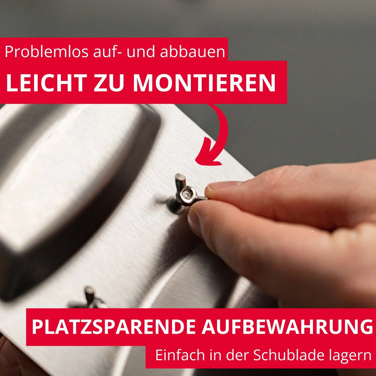 Das Auf- und Abbauen ist einfach und ermöglicht platzsparendes Verstauen in der Küchenschublade. Aus rostfreiem Edelstahl gefertigt, ist die Ablage langlebig, robust und spülmaschinengeeignet.