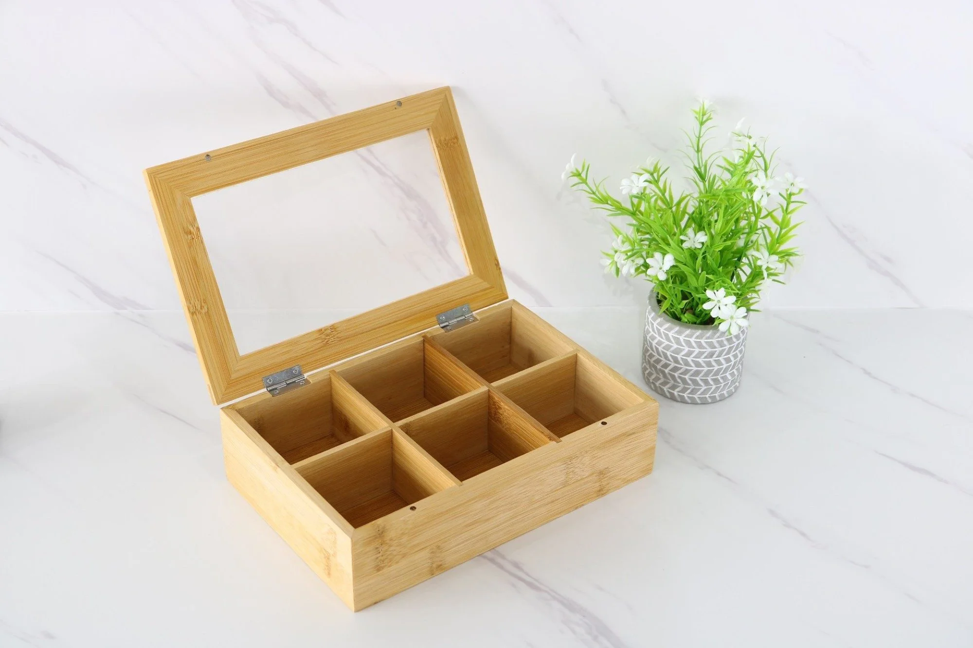 Die Cheffinger Bambus Teebox mit 6 Fächern ist ideal zur ordentlichen Aufbewahrung von Teebeuteln, Gewürzen, Kaffee, Schmuck oder kleinen Accessoires. Der Klappdeckel mit Sichtfenster schützt den Inhalt und sorgt für Übersicht.