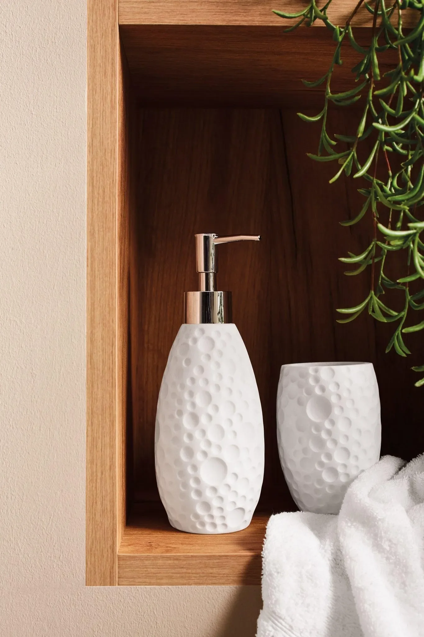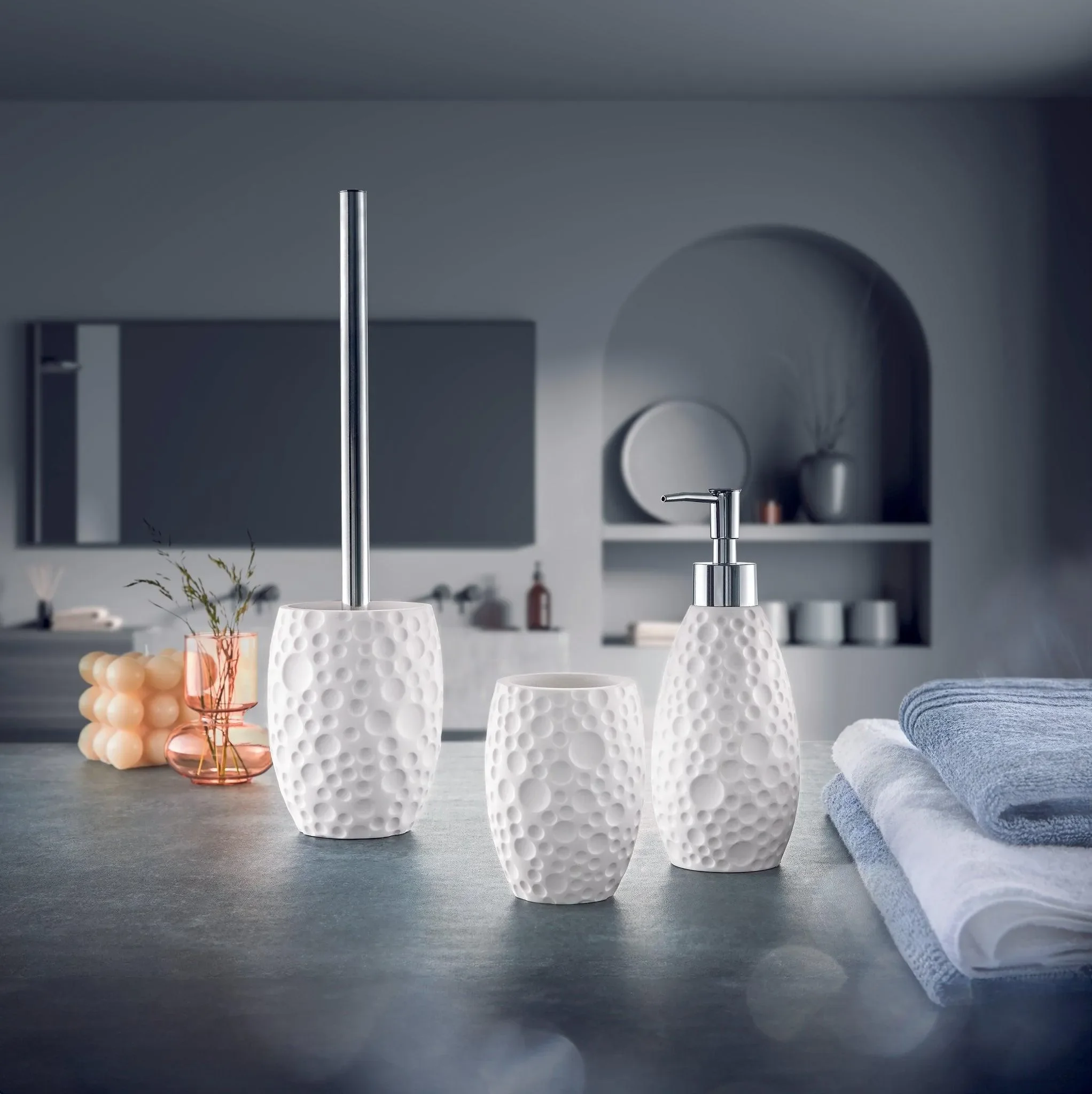 Highlights: Dekorative Krater-Struktur, matte Oberfläche, hochwertige Haptik, zeitloses Design, vielseitig einsetzbar im Badezimmer.